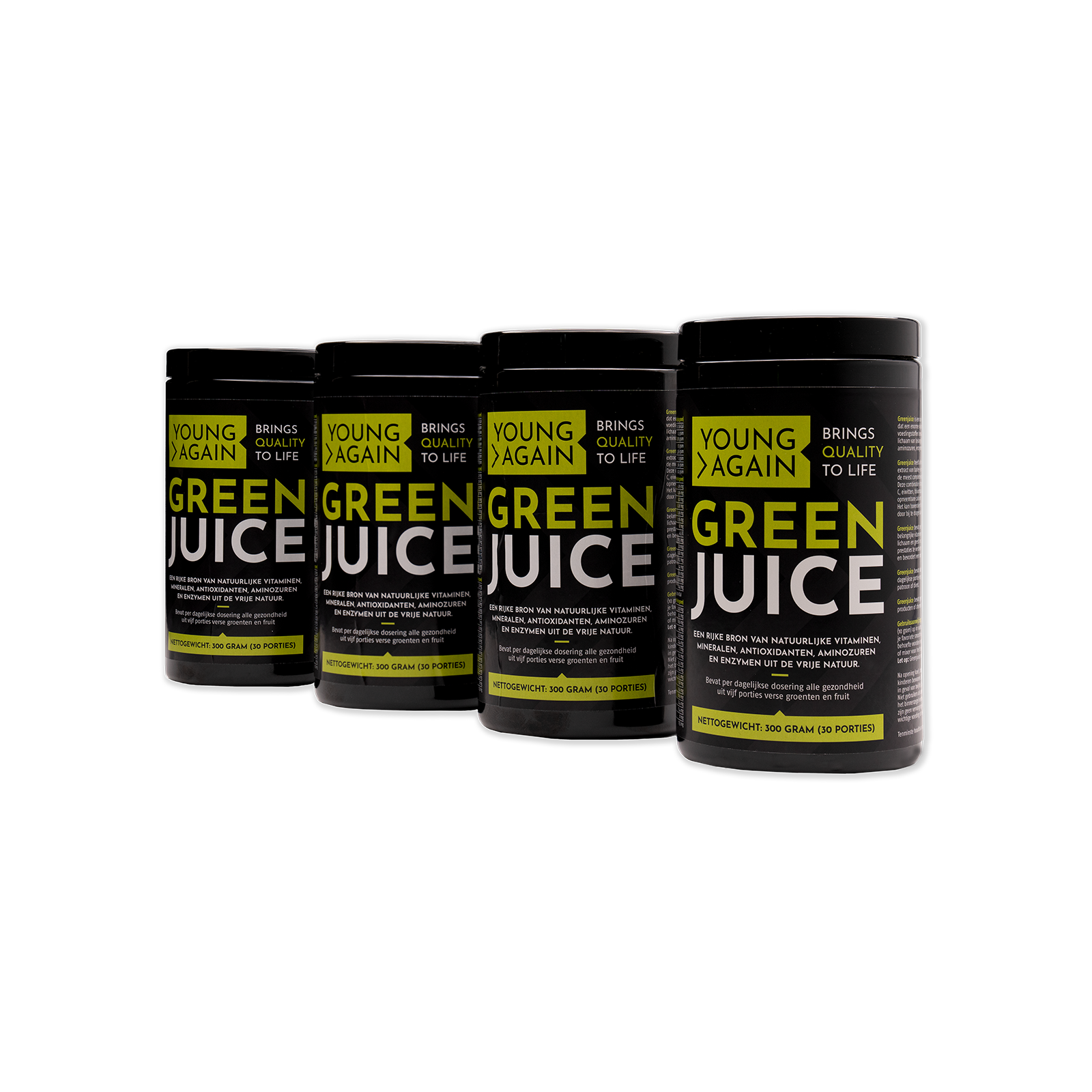 Met Young Again Greenjuice voed je jouw lichaam met alle belangrijke (100% natuurlijke) vitamines, mineralen, aminozuren, enzymen en antioxidanten. Greenjuice helpt bij het voorkomen en voorkomen van een neutrale pH-waarde van het lichaam.Young Again Greenjuice is een uitstekende aanvulling op elk dieet.